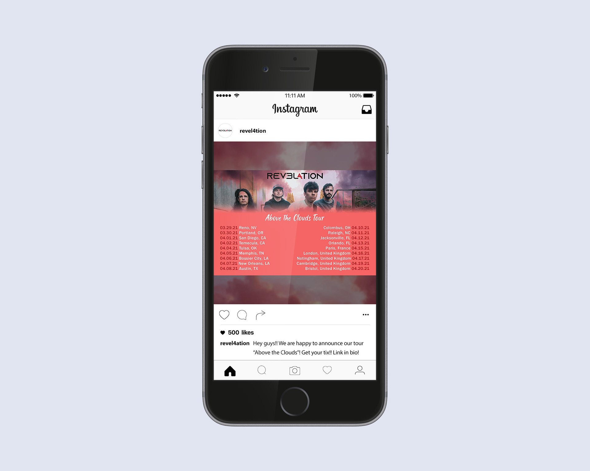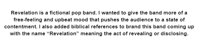 Revelation is a fictional pop band. I wanted to give the band more of a free-feeling and upbeat mood that pushes the audience to a state of contentment. I also added biblical references to brand this band coming up with the name “Revelation” meaning the act of revealing or disclosing.